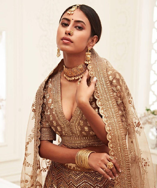 Beige Net Lehenga Choli with Delicate Thread Embroidery Unstitched
