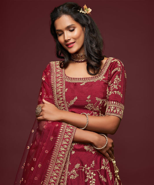 Maroon Art Silk Lehenga Choli with Exquisite Thread Work Unstitched