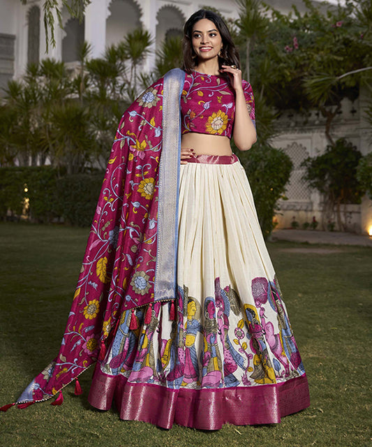 Off-White and Pink Jacquard Silk Lehenga Choli with Dupatta Unstitched