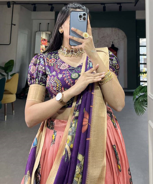 Women's Dola Silk Lehenga Choli with Kalamkari Print Unstitched