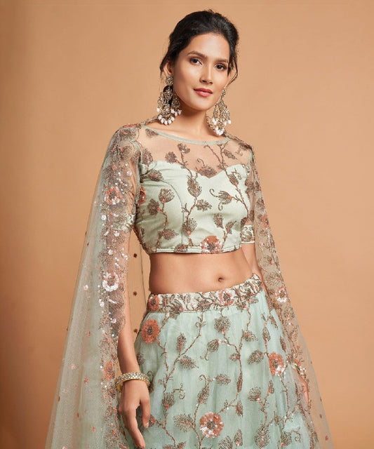 Pista Green Thread Embroidered Net Lehenga Choli Unstitched