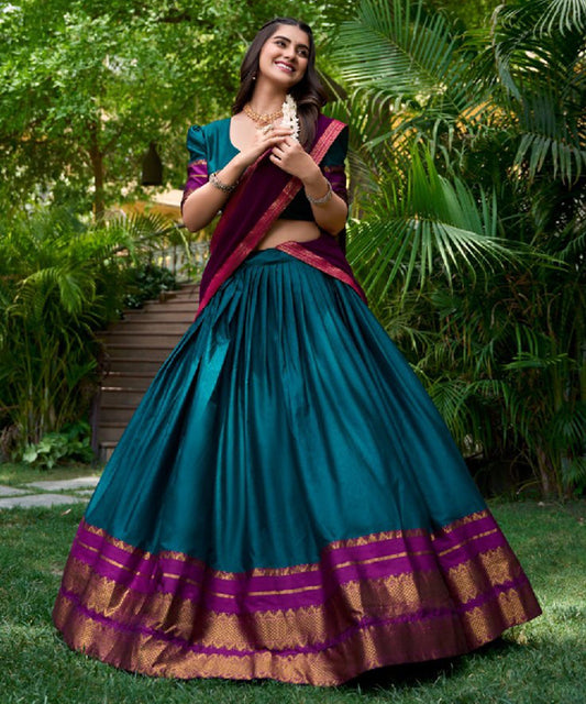 Teal Cotton-Poly Lehenga Choli with Zari Detailing Unstitched