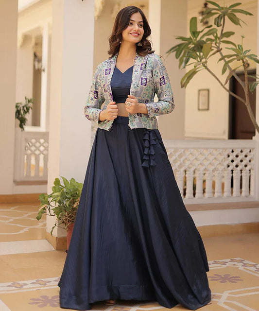 Navy Blue Jacket Style Anarkali Wedding Lehenga Choli Unstitched
