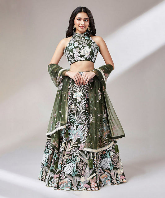 Lehenga Olive Net Sequin Work with Dupatta & Unstitched Blouse Unstitched