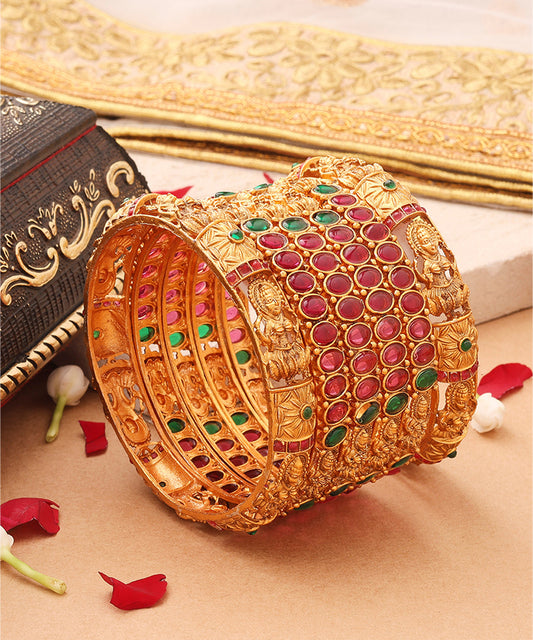 Broad Gold Plated Bangle with Intricate Motif and Gemstone Accents