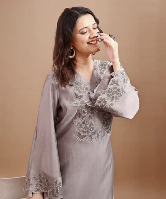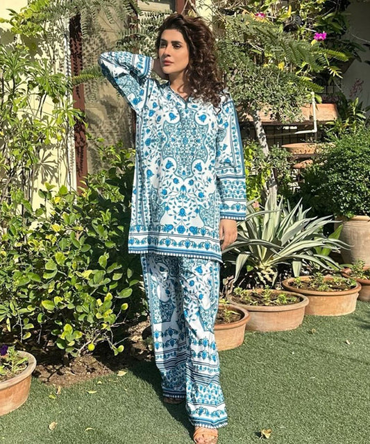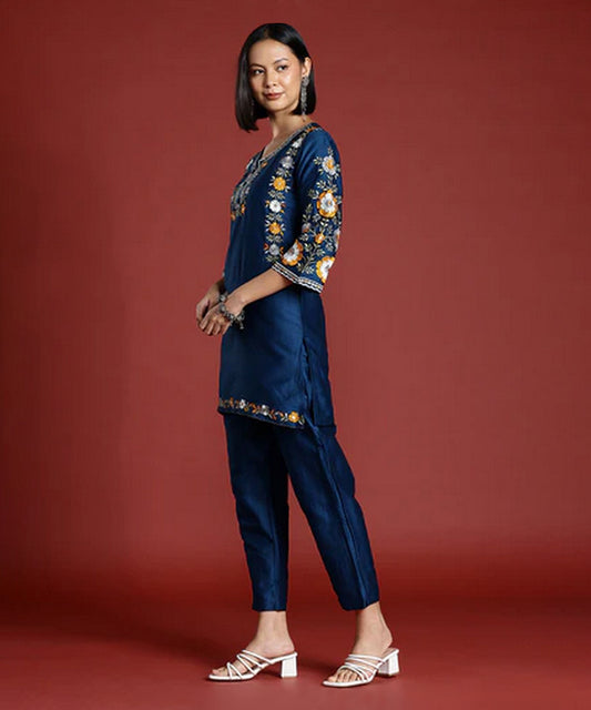 Co-ord Set Elegant Blue Cotton Blend Embroidered Kurta & Pant