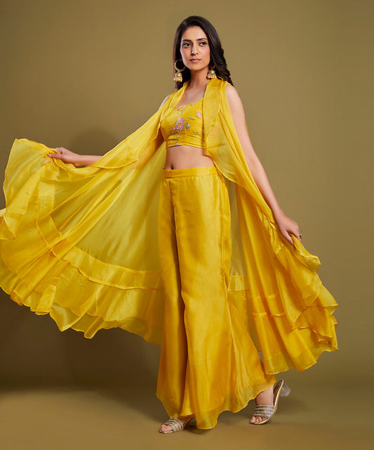 Indo Western Yellow Organza Embroidered Top with Palazzo and Jacket