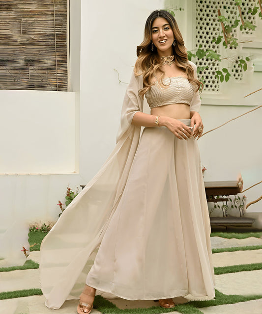 Indo Western Beige Georgette Embroidered Top with Palazzo and Jacket