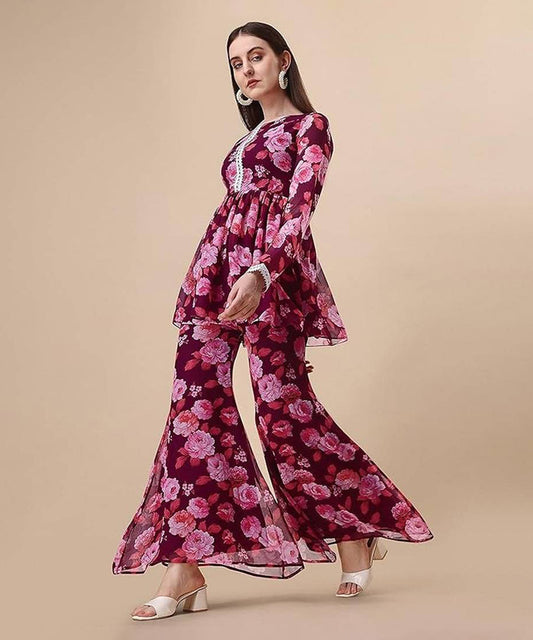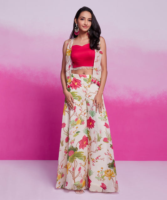 Indo Western Pink Organza Top with Printed Palazzo and Jacket