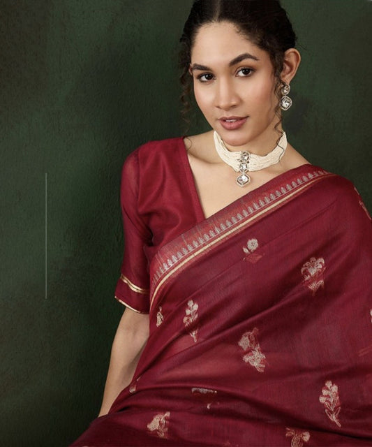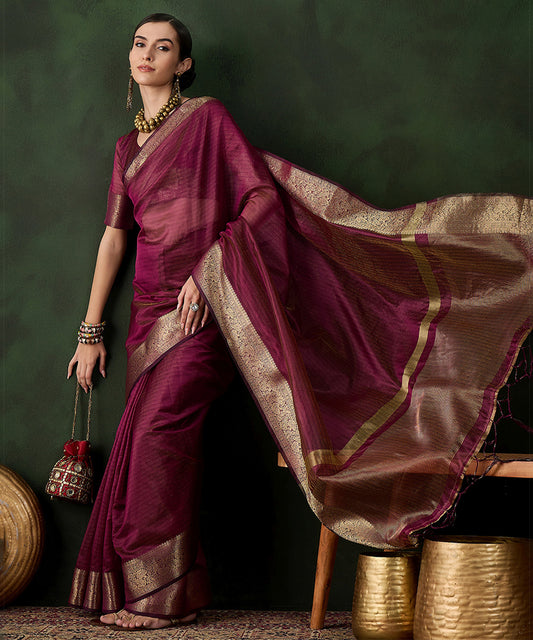 Plum Cotton Silk Saree with Ornate Gold Zari Border