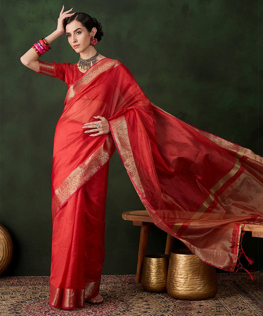 Scarlet Red Cotton Silk Saree with Intricate Zari Border