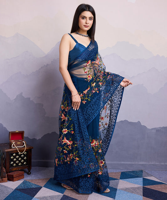 Navy Blue Net Saree with Delicate Embroidery and Stylish Blouse