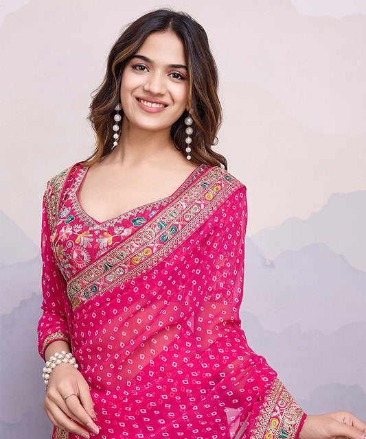 Pink Bandhani Georgette Saree with Traditional Embroidered Border