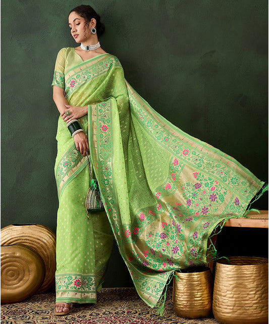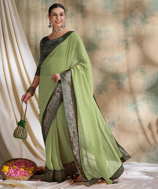 Light Green Saree with Zari Woven Border and Dark Green Blouse