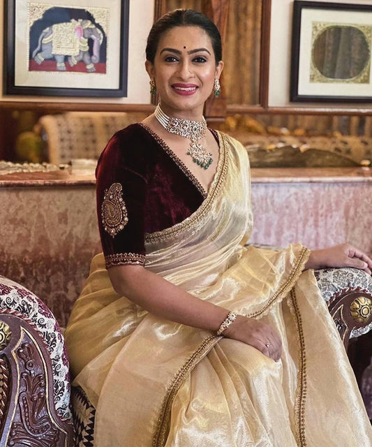 Cream Tissue Silk Saree with Velvet Embroidered Blouse