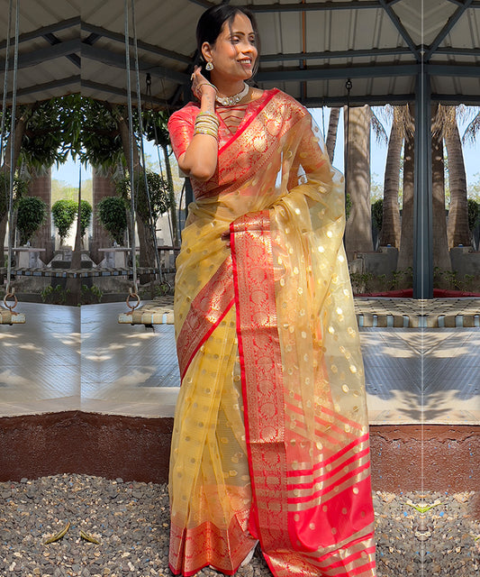 Golden Yellow & Red Organza Silk Saree