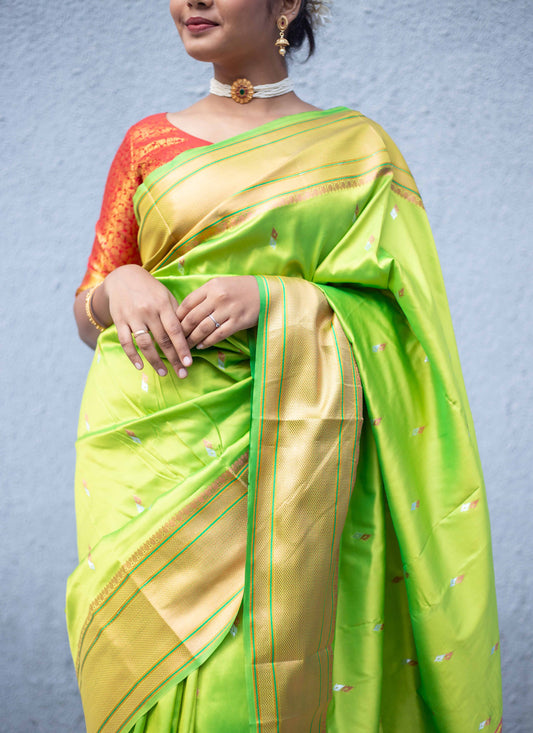 Lime Green Paithani Saree with Multicolor Zari Border