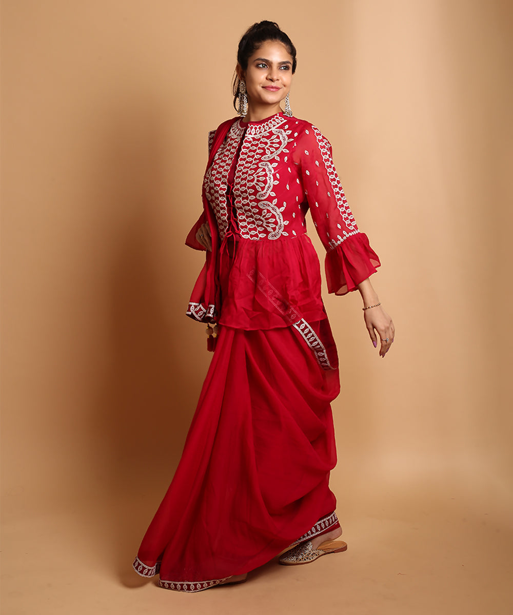 Make a bold style statement with this crimson designer saree, paired with a trendy jacket-style ready blouse. The fusion of contemporary tailoring with traditional drape creates a striking look ideal for receptions, parties, and festive evenings. Rich in color and style, this ensemble is designed to turn heads effortlessly.