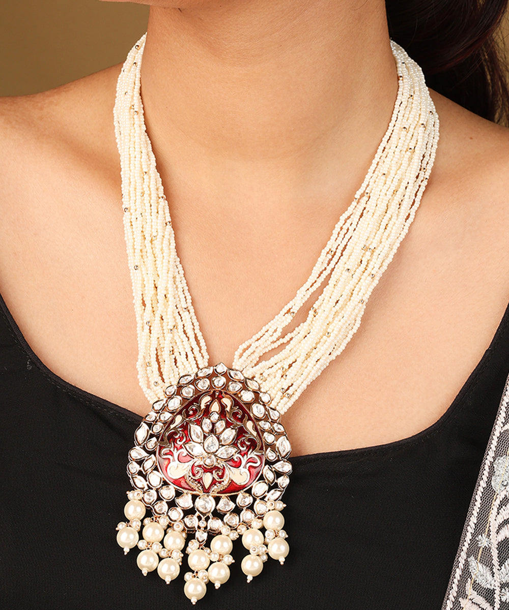 A mesmerizing raindrop pendant necklace with red and transparent stones, paired with pearl jhumkis